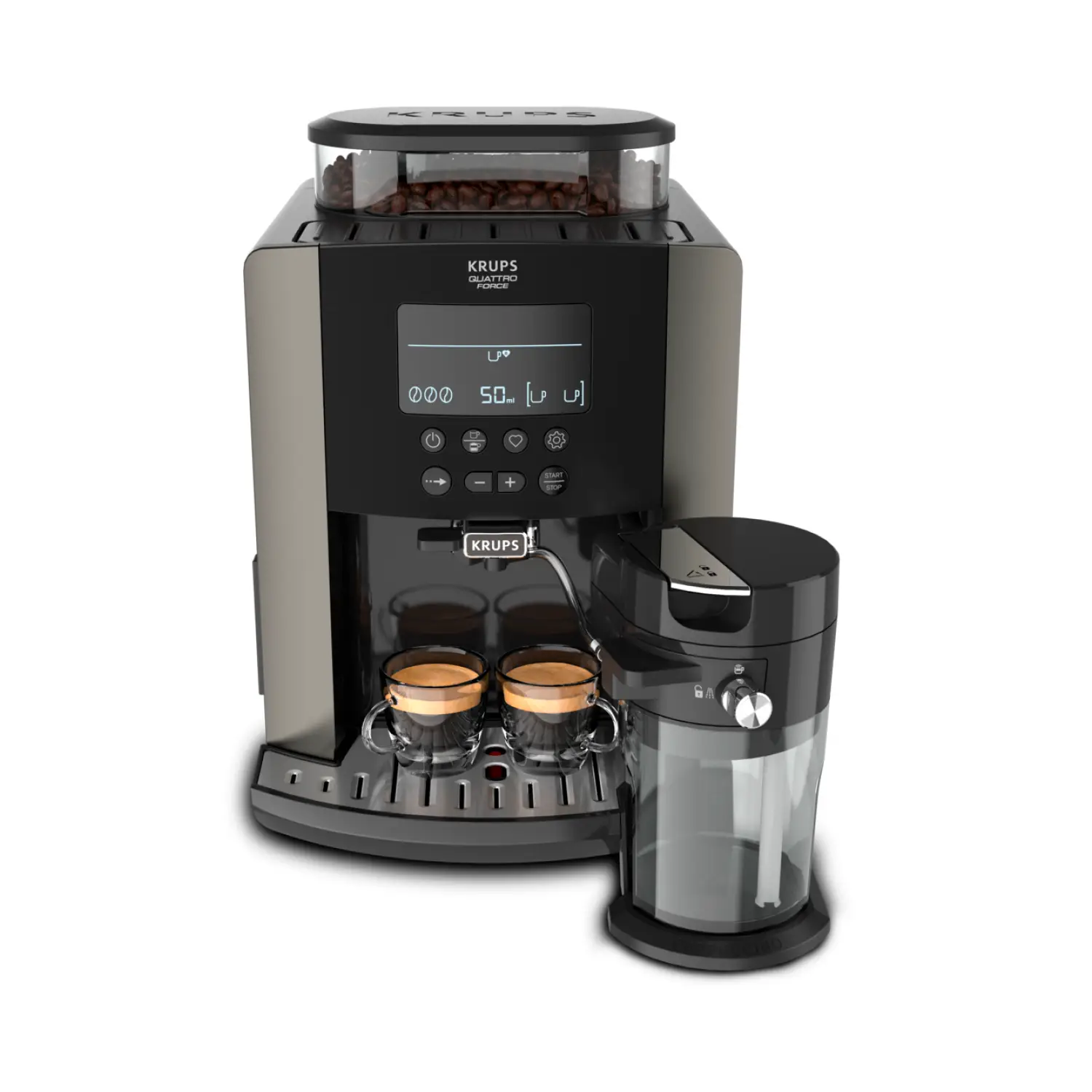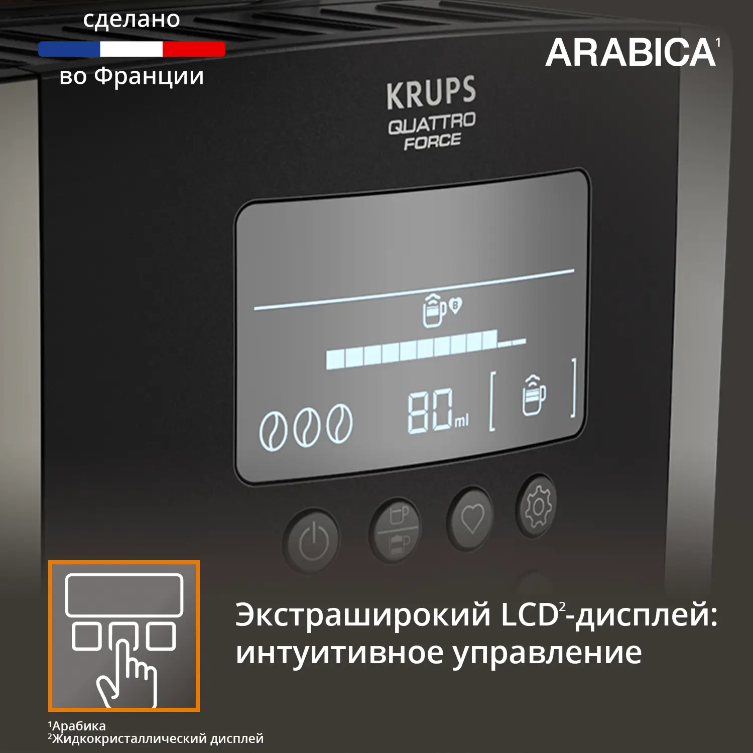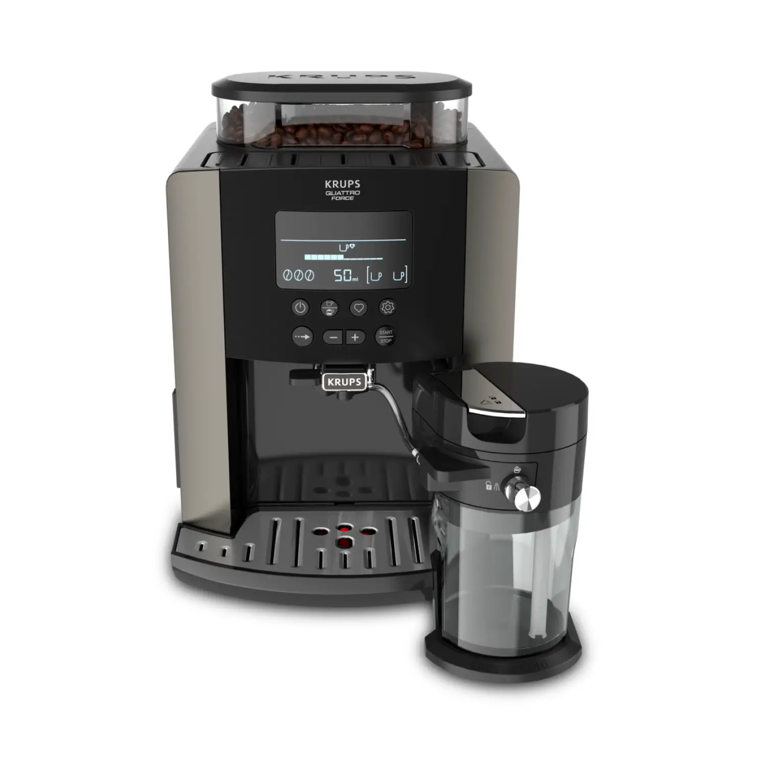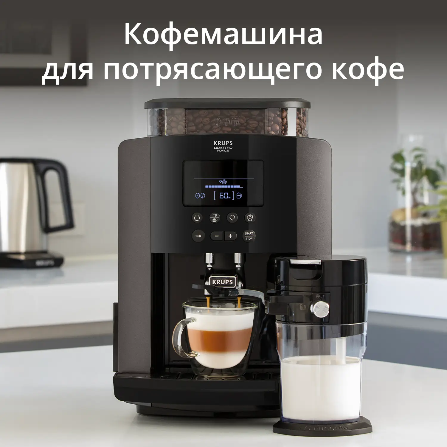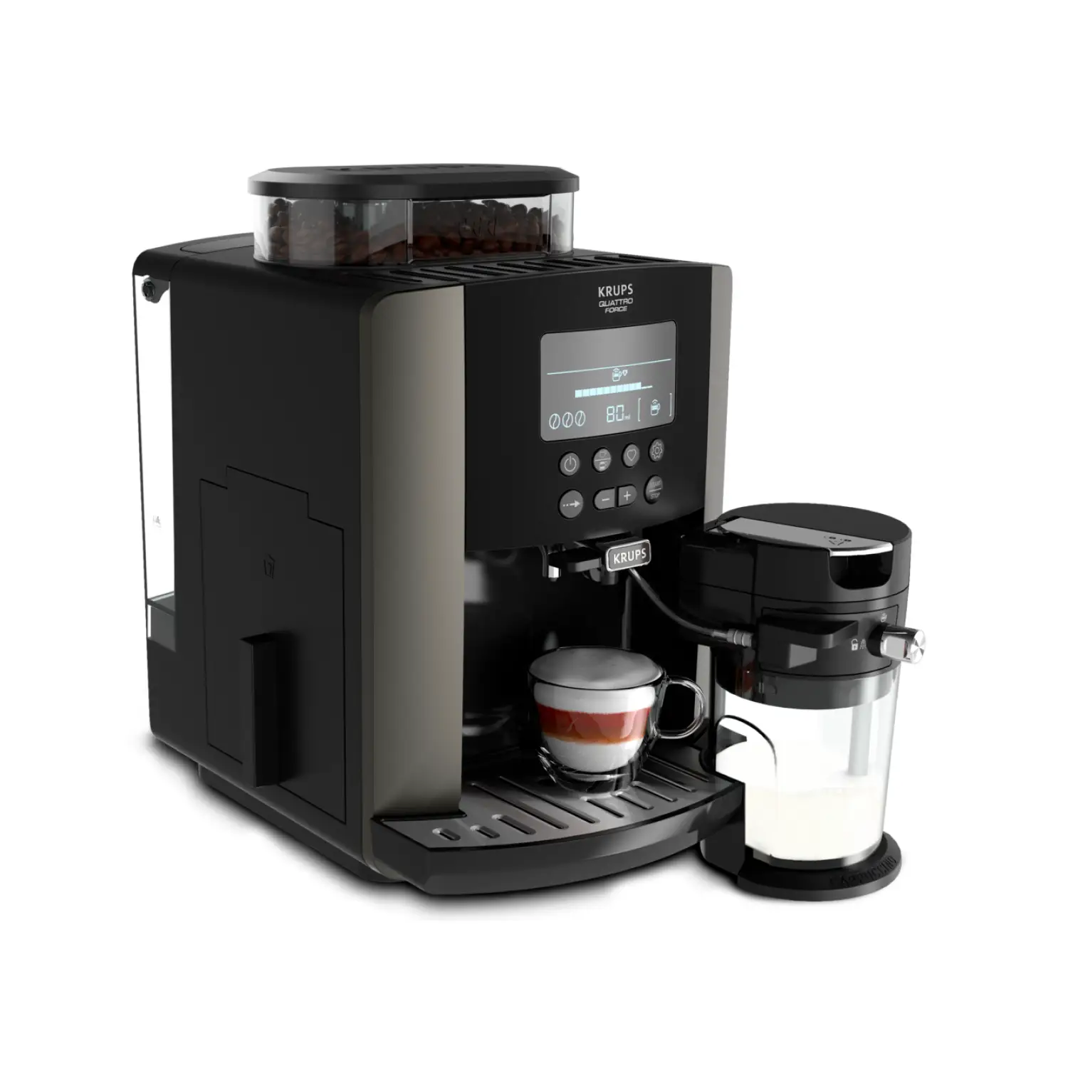 Автоматическая кофемашина KRUPS Arabica Latte позволит вам наслаждаться потрясающе вкусными и ароматными кофейными напитками у себя дома. Благодаря большому и удобному LCD-дисплею вы легко приготовите эспрессо или капучино одним нажатием кнопки. Три предустановленные программы для молочных напитков предназначены для создания воздушной и кремовой молочной пены по вашему вкусу, а интеллектуальная система сохранит до четырех ваших любимых рецептов. Кофемашину просто чистить – резервуар для воды легко снимается, а капучинатор быстро разбирается на три части. В дополнение ко всему инновационная технология KRUPS Quattro Force поможет добиться потрясающего вкуса и аромата в каждой чашке кофе.