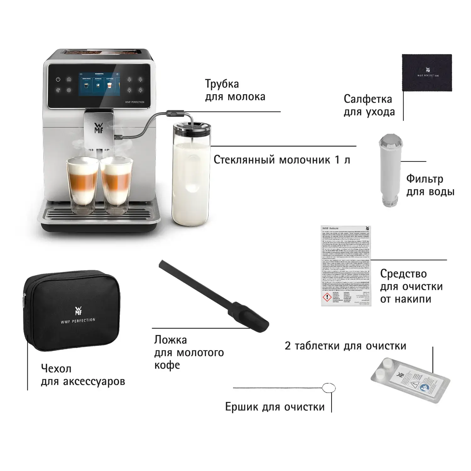 Фильтр для воды с инструментом для установки - 1 шт, чистящая таблетка - 2 шт, средство для удаления накипи - 1 шт, тест-полоска для проверки жесткости воды - 1 шт, мерная ложка для молотого кофе - 1 шт, щеточка для чистки - 1 шт, салфетка для очистки - 1 шт, трубка для молочной системы с насадкой из нержавеющей стали Cromargan - 1 шт, стеклянный резервуар для молока 1 л - 1 шт.